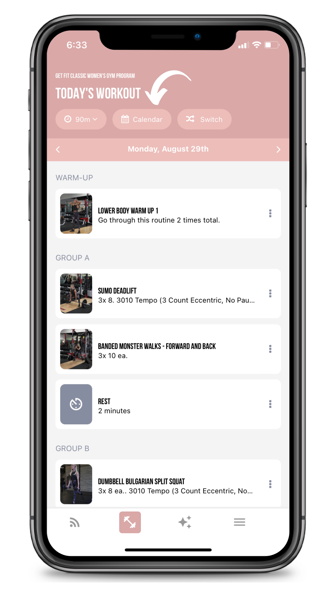 1. From the workout screen click the calendar icon at the top of the screen.