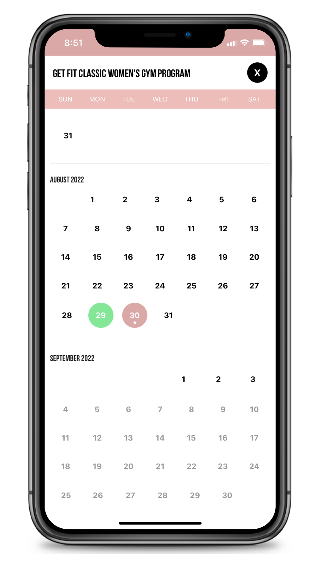 3. All previously completed workouts will be marked green.